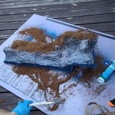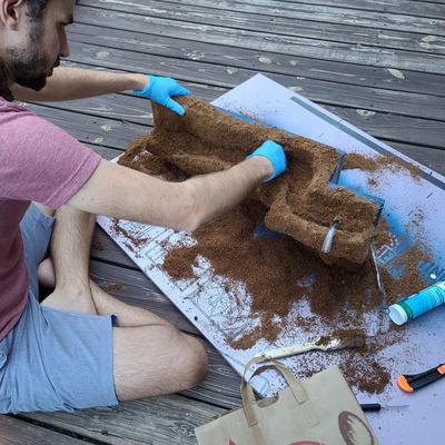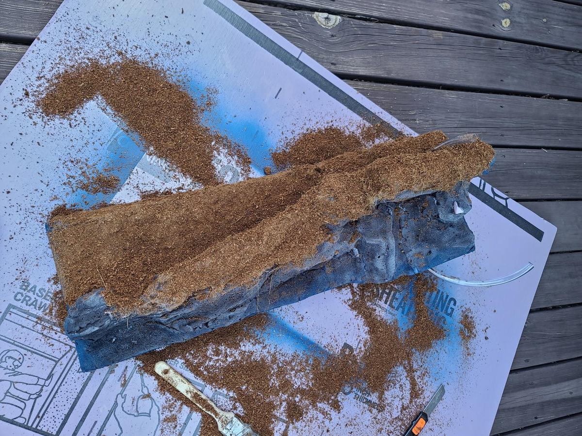 Once I cut the expanding foam down to shape I was looking for, I coated the surface with silicone and pressed coconut fibers into it. I also created an opening and inserted a tube for the water supply to the top of the waterway, sealing it with more silicone.