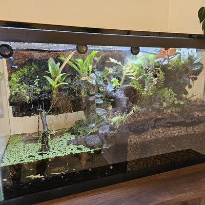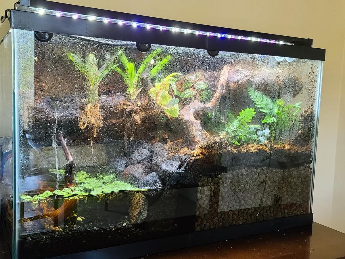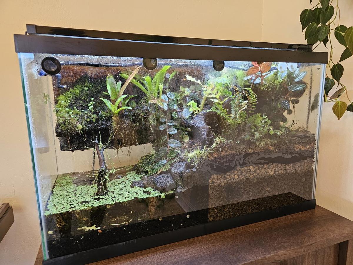 In October of 2022 I decided to make a Paludarium. A paludarium is like a mix between a terrarium and an aquarium. (The name comes from the latin word "palus", which means marsh.) I'm really into gardening and houseplants, and I've always been interested in getting an aquarium. When I learned about paludariums I knew I wanted to build one. I also was very interested in the idea of creating a somewhat stable ecosystem, minimizing the need to change the water and add food, with the main input just being light. I'm not a purist about this, but it is something I try to work towards.