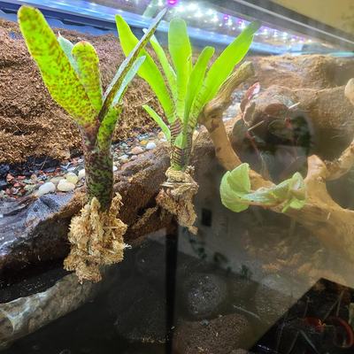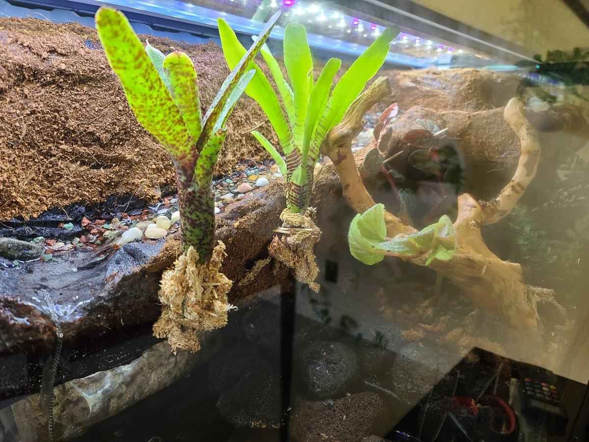 I wanted to plant the tank fairly heavily such that nitrates would be readily pulled out of the water, reducing the need for water changes. For the plants I got two small Neoregelias, a Begonia ulmifolia, a Pellionia pulchra, a variety of Peperomia, and two other fern species that I can't identify. I largely chose these on a whim, just looking at what others seem to put in Paludariums. I attached the Neoregelias to the backdrop with toothpicks, and planted the rest in the soil. I also spread a live moss slurry over the backdrop. This starts off as just a brown goo, but eventually grows into a thicker blanket of moss. I also spread some leaf litter on the ground around the plants. I added springtails and some terrestrial isopods to the paludarium. These are the "Clean-up crew". They eat dead plant matter, mold, and generally keep the paludarium clean and healthy.