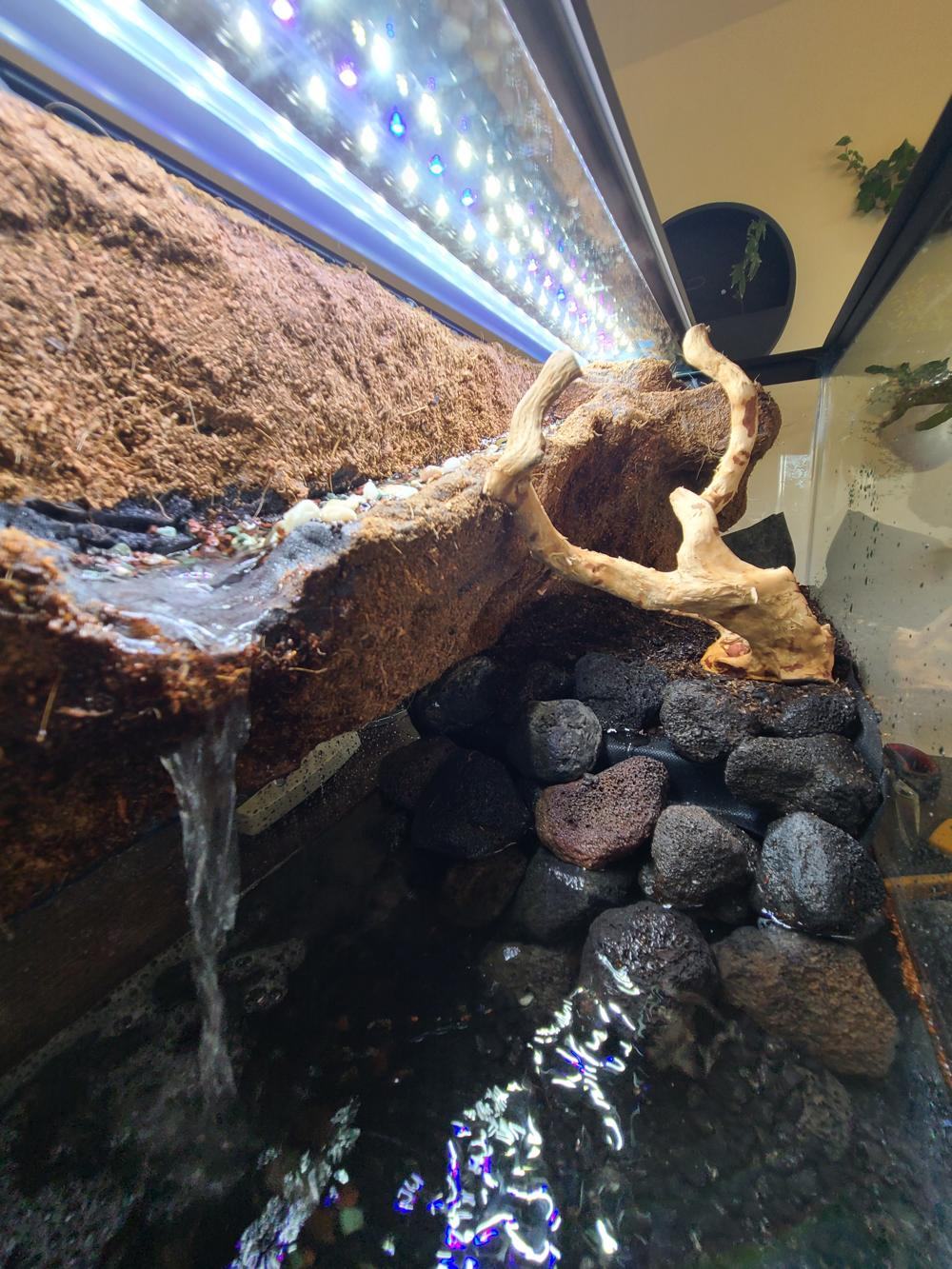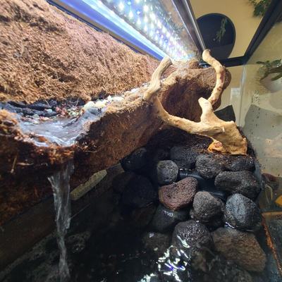 Once the silicone had cured and aired out, it was time to assemble. I rinsed the backdrop thoroughly and attached it to the inside of the tank with silicone on the glass. I split the base of the tank into two sections, separated by sponge filter. On the water side I laid down aquarium gravel, and on the land side I laid expanded clay up to slightly above water level (the false bottom), and then laid a substrate barrier (basically a piece of synthetic fabric) and then dirt on top. I placed lava rocks against the sponge filter on the water side, to improve the appearance and give a place for the future inhabitants to hide. I hooked up the pump system such that water flowed down the waterway and over the waterfall, and set up the misting system to spray mist into the tank a few times a day. I also placed a few pieces of spider wood, one in the water, and one that I placed in the soil, and glued to the backdrop.
