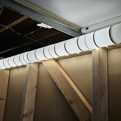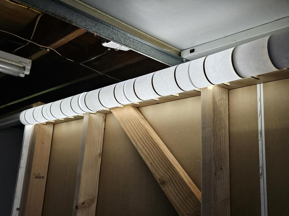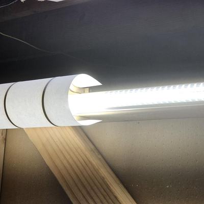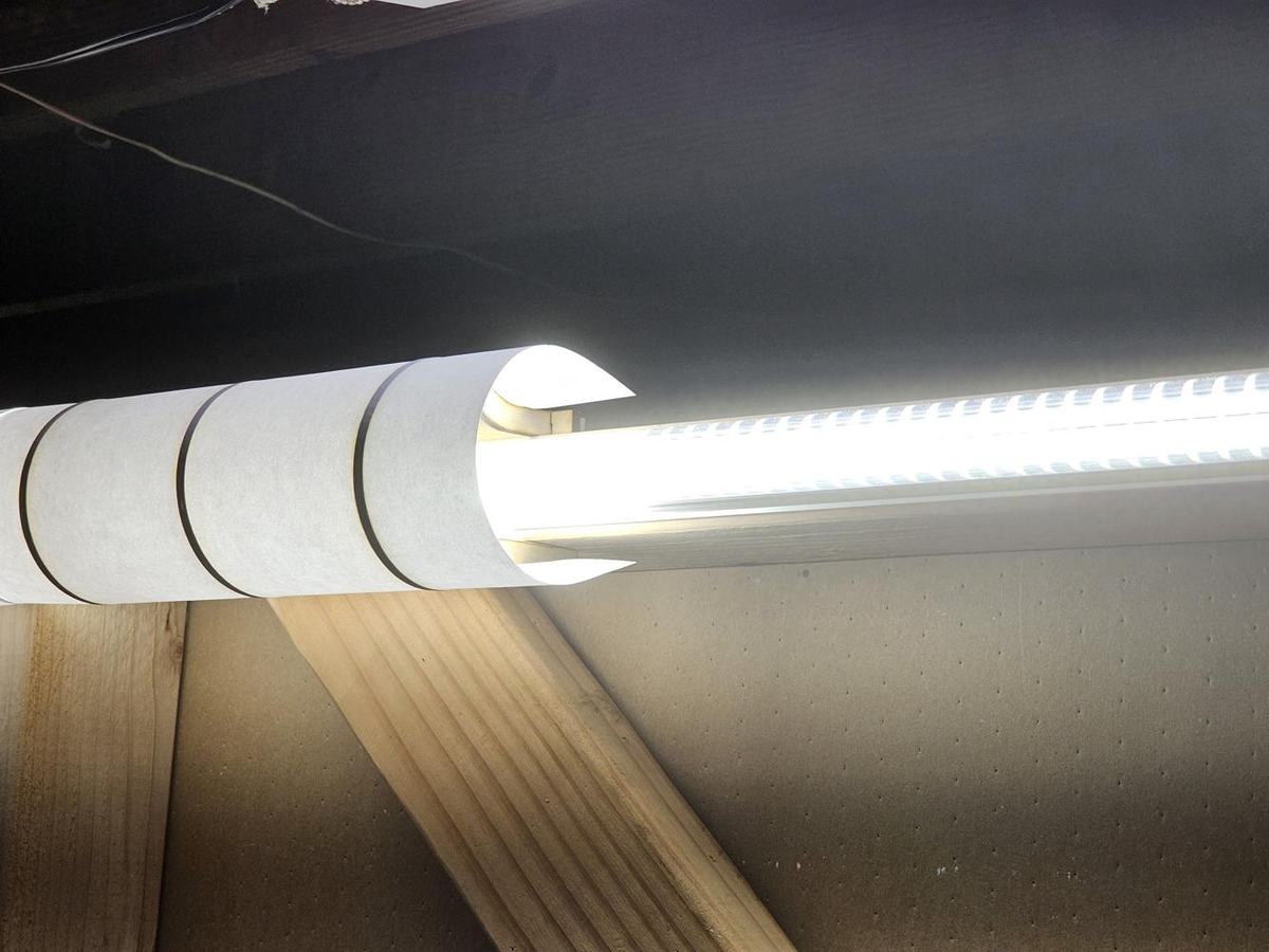 The light fixture is mounted to a horizontal 2x4 in my garage, so the bracket just press fits around the board. I made 5 brackets and glued paper to them, then lined them up on the light fixture.