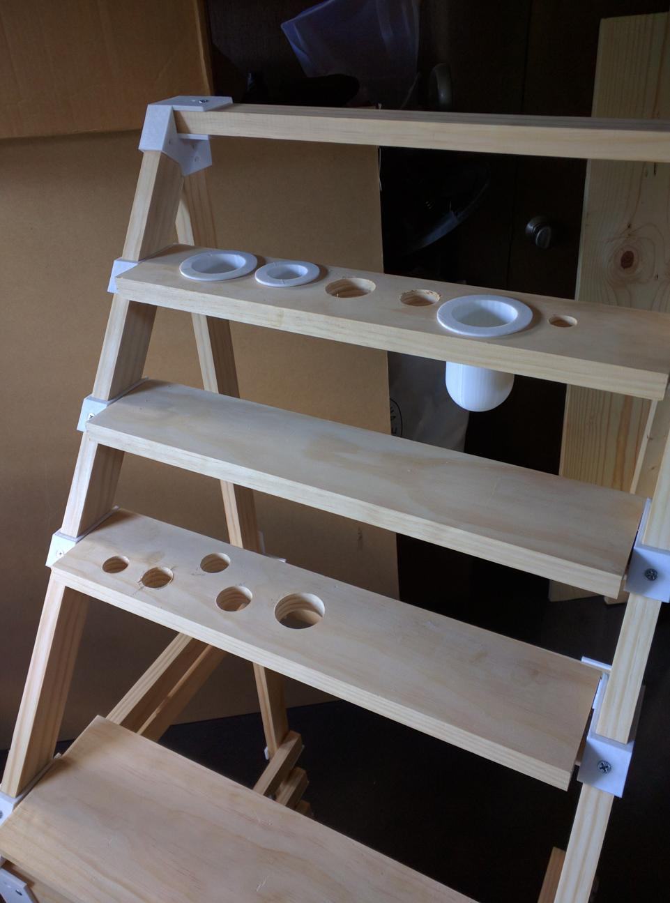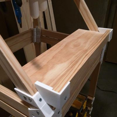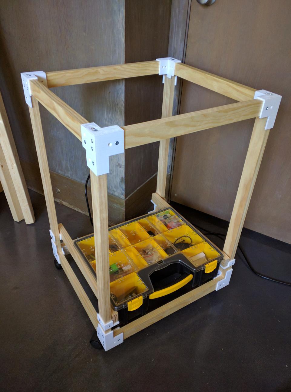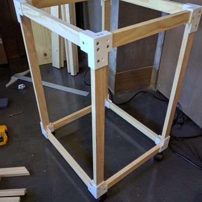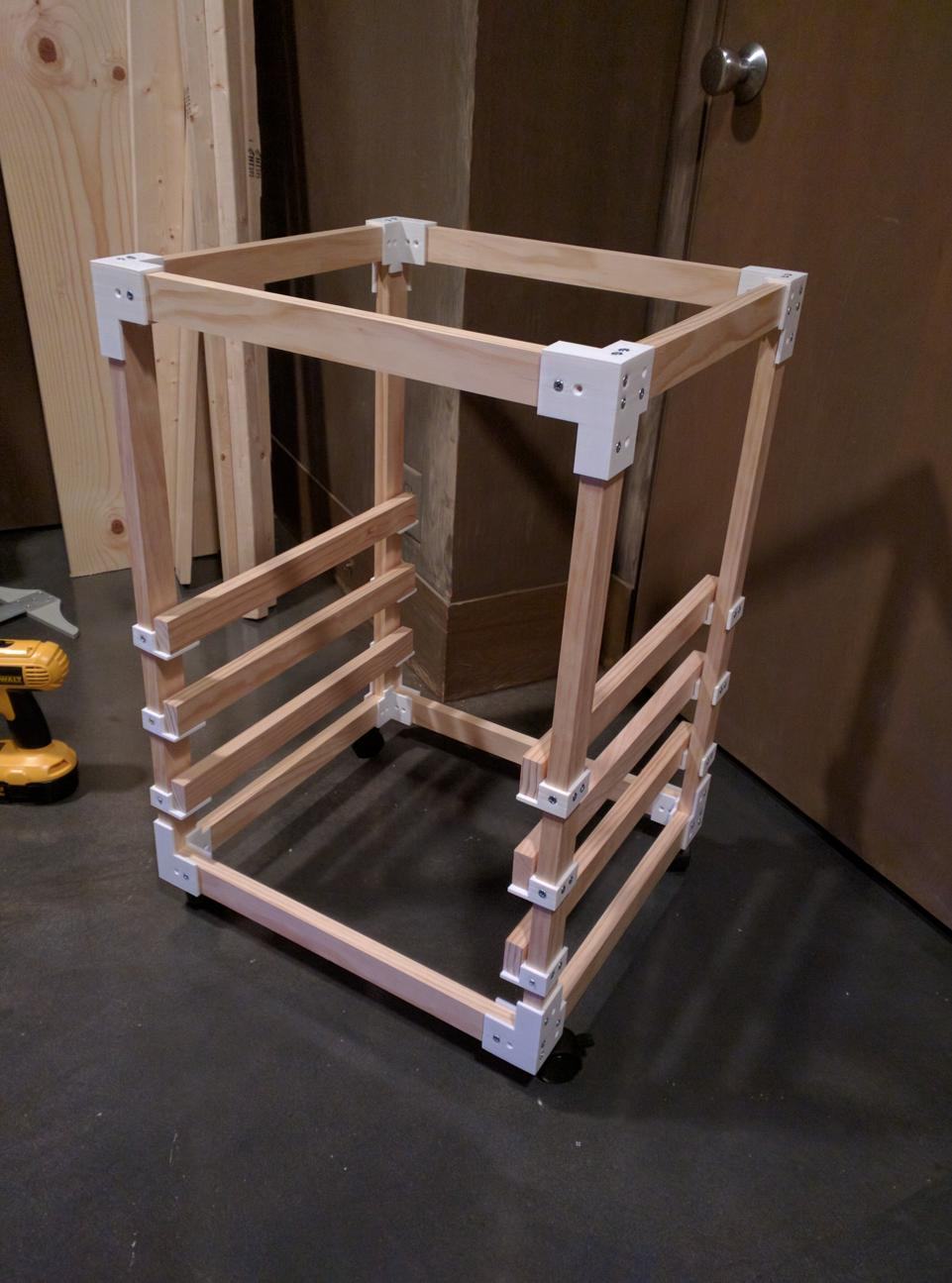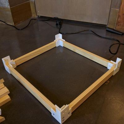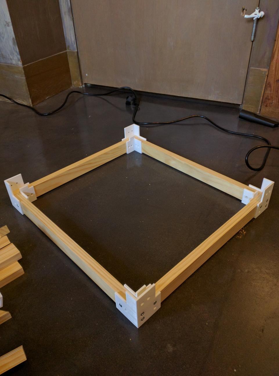 I first designed the frame. At ~2 hours printing time per joint, this ended up being a fair amount of printing, but I had it done in a day or two. After cutting the wood to length, I was ready to begin assembly.